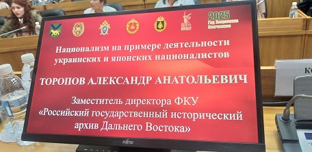 В рамках секции «Наследники Великой Победы» заместитель директора РГИА ДВ Александр Анатольевич Торопов представил доклад «Национализм на примере деятельности украинских и японских националистов».